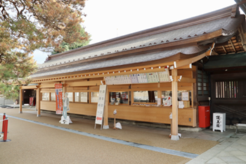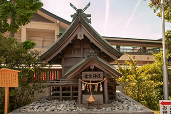 出雲大社と同じ形式の「大社造」で、6社並ぶ境内社の中で独特の形式をもち、日本最初の神社建築様式と言われています。大きさは、出雲大社の規模の8分の1。一般には、縁結びの神、農耕守護の神、福徳出世開運の神として信仰を集めています。