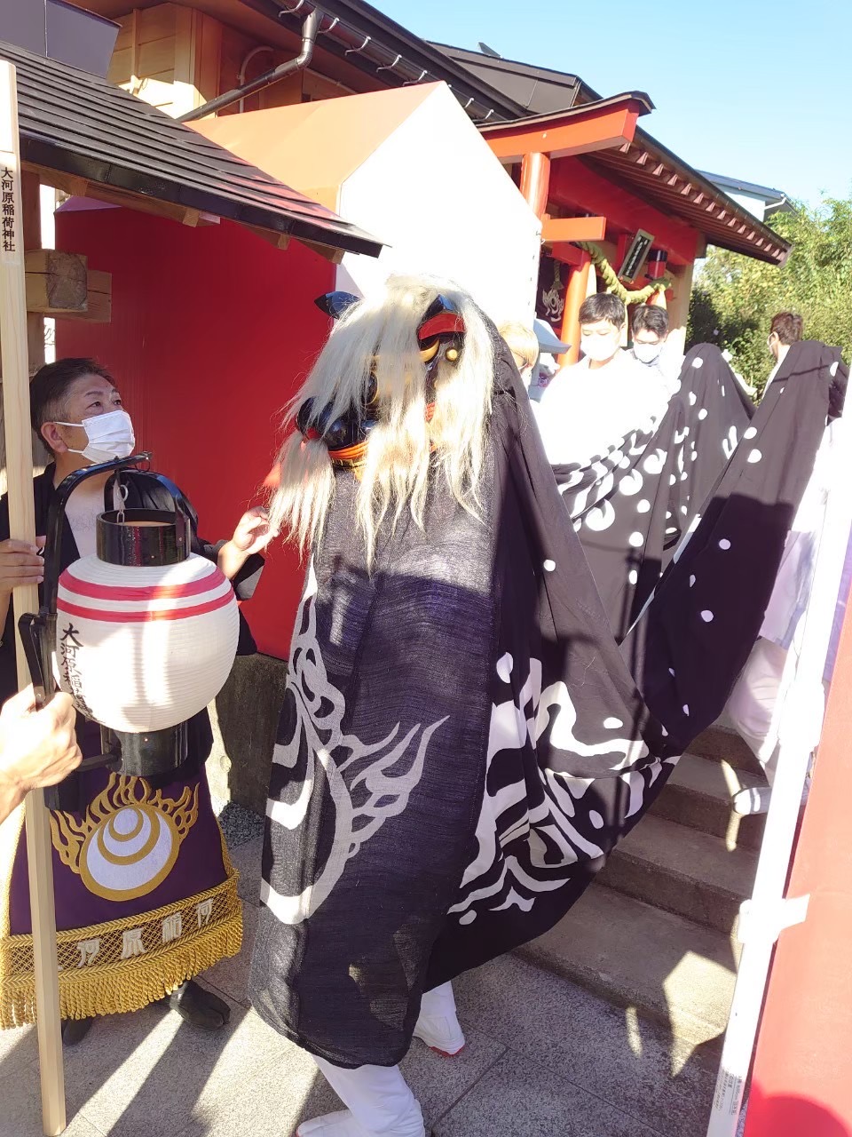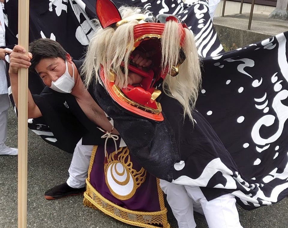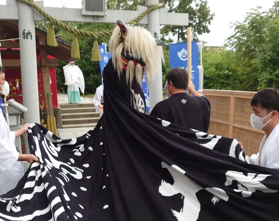 黒獅子は、顔を背けながら大きく蛇行する不思議な動きで町内を練り歩きます。その姿はまるで水をくねらせて進む龍のよう。舞の最中には「警護」と呼ばれる者が獅子頭の傍らに付き添い、動きを巧みに操ります。例祭日には神社から出発した黒獅子が、こうした舞を通して家々を祓い清め、再び神社へ戻って奉納されます。